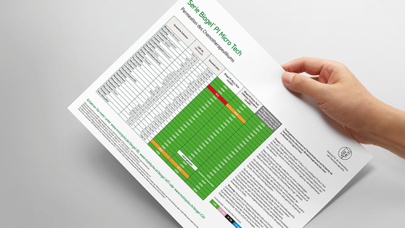 Den besten Schutz bieten Handschuhe, die optimal für die verwendeten Chemikalien oder Zytostatika ausgelegt sind. In unseren detaillierten Permeations-Datenblättern finden Sie Angaben zu einer Vielzahl marktgängiger Produkte.