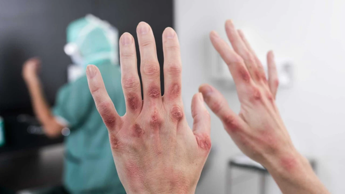 der Chirurgen und Pflegekräfte haben im Operationssaal persönlich eine Hautreaktion an ihren Händen erlitten.