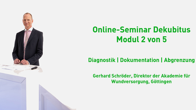 In dieser neuen und kostenfreien Online-Seminar-Reihe behandelt Gerhard Schröder das Thema Dekubitus auf anschauliche Weise mit interessanten Fallbeispielen und hilfreichen zusätzlichen Informationen. Dieser zweite Teil der Reihe widmet sich in knapp 20 Minuten den Themen Diagnostik, Dokumentation und Abgrenzung, hier vor allem von der IAD. Schauen Sie sich jetzt das Online-Seminar an, beantworten Sie die Fragen der Lernerfolgskontrolle und erhalten Sie im Nachgang eine persönliche Teilnahmebestätigung. Dekubitus. Wie entsteht er - und so vergeht er... Teil 2: Diagnostik, Dokumentation und Abgrenzung