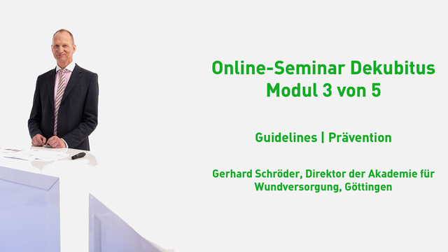 In dieser neuen und kostenfreien Online-Seminar-Reihe behandelt Gerhard Schröder das Thema Dekubitus auf anschauliche Weise mit interessanten Fallbeispielen und hilfreichen zusätzlichen Informationen. Dieser dritte Teil der Reihe widmet sich den Themen Guidelines und Prävention. In knapp 30 Minuten werden die aktuellen Leitlinien des Expertenstandards und der EPUAP werden vorgestellt und darauf aufbauend sinnvolle Präventionsmaßnahmen erläutert. Schauen Sie sich jetzt das Online-Seminar an, beantworten Sie die Fragen der Lernerfolgskontrolle und erhalten Sie im Nachgang eine persönliche Teilnahmebestätigung. Dekubitus. Wie entsteht er - und so vergeht er... Teil 3: Guidelines und Prävention