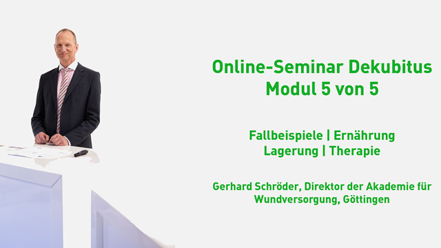 In dieser neuen und kostenfreien Online-Seminar-Reihe behandelt Gerhard Schröder das Thema Dekubitus auf anschauliche Weise mit interessanten Fallbeispielen und hilfreichen zusätzlichen Informationen. Dieser fünfte und letzte Teil der Reihe widmet sich in kurzweiligen 25 Minuten konkreten Hinweise zu Ernährung, Lagerung und Therapie inklusive Fallbeispielen. Anhand von Wundfotos erläutert Gerhard Schröder, wie Patienten erfolgreich behandelt wurden und gibt Ihnen eine Checkliste zum Vorgehen bei Dekubitalulcera an die Hand. Schauen Sie sich jetzt das Online-Seminar an, beantworten Sie die Fragen der Lernerfolgskontrolle und erhalten Sie im Nachgang eine persönliche Teilnahmebestätigung. Dekubitus. Wie entsteht er - und so vergeht er... Teil 5: Fallbeispiele, Ernährung, Lagerung, Therapie