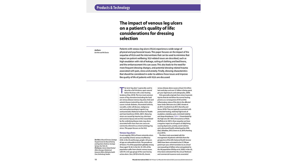 VLUs beeinträchtigen die Lebensqualität von Patienten aufgrund ihrer chronischen Natur und der damit verbundenen Komorbiditäten, wie z.B. dem Auslaufen von Exsudat, Unbehagen und Schamgefühl, erheblich. Der im Jahr 2023 in "Wounds International" veröffentlichte Artikel beleuchtet Überlegungen zum Management von Ulcus cruris venosum und unterstreicht die Rolle der Verbandauswahl zur Verbesserung des Wohlbefindens der Patienten und der Wiederherstellung des Selbstvertrauens.