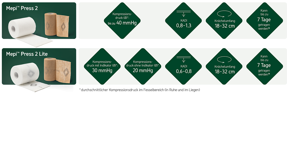 Mepi™ Press 2 und Mepi™ Press 2 Lite sind unsterile Mehrkomponenten-Kompressionssysteme für den Einmalgebrauch. Sie sind für die Langzeitbehandlung in der Kompressionstherapie indiziert. Mepi™ Press 2 Lite wird zudem für Patienten empfohlen, die besonders schmerzempfindlich auf Kompressionstherapie reagieren oder bei denen eine stufenweise Erhöhung des Kompressionsdruckes erfolgen soll.