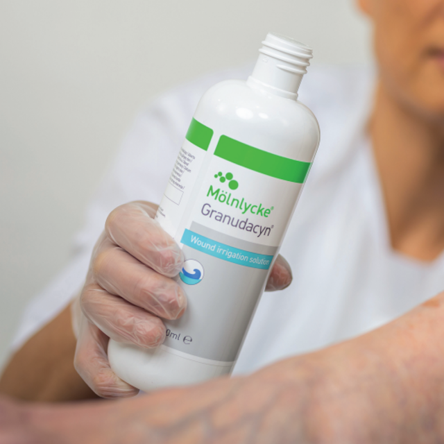 Wound cleansing is an essential component in treating DFUs. Wound cleansers, such as Granudacyn®, support wound healing through the mechanical effect of rinsing which can reduce the risk of infection.