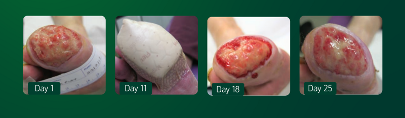 - Over the treatment period, the condition of the wound improved and at the final follow-up visit the wound bed was composed of 98% epithelial tissue and 2% granulation tissue
