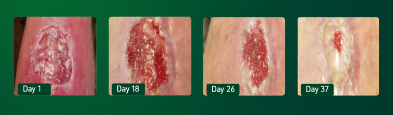 - Mechanical wound debridement (curette or debridement pad) performed at dressing change until day 18; the wound was cleansed using tap water at all dressing changes.