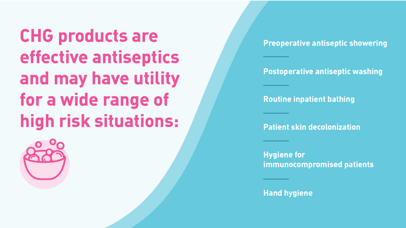 - Offers solid clinical evidence of preventing HAI-related complications. This can subsequently shorten length of stay and decrease readmissions. These outcomes are, ultimately, the most important considerations when looking at CHG products.