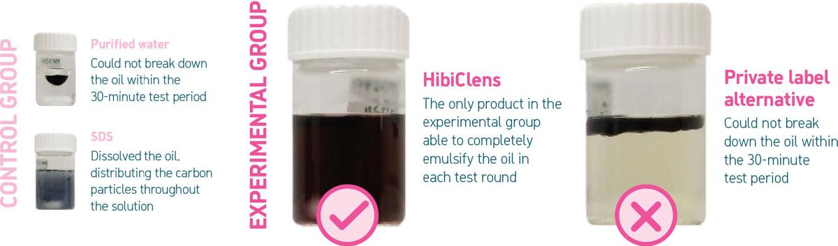 In a study, HibiClens demonstrated higher cleansing abilities compared to a private label alternative, using an in-vitro synthetic sebum model . Researchers simulated the cleansing process and found that HibiClens was able to completely emulsify the synthetic sebum under the conditions of the test, while the private label alternative did not produce any emulsification.² -