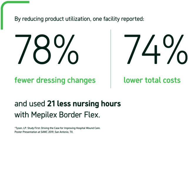Saving a few pennies on a single dressing might cost you more if you have to use more of them per patient. We design our products to optimize efficiency in both acute and post-acute settings. Our Mepilex® Border Flex foam dressings are shown to stay on longer and better adhere to patients’ skin, with flexibility in all directions. Clinicians can confidently increase the time between dressing changes without sacrificing patient comfort.