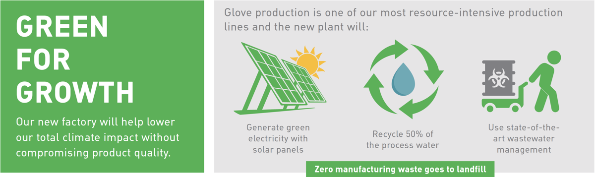 We are committed to reducing greenhouse gas emissions. Therefore, we use solar energy in the gloves packing factory (photo above), and there are similar plans for the manufacturing factories.