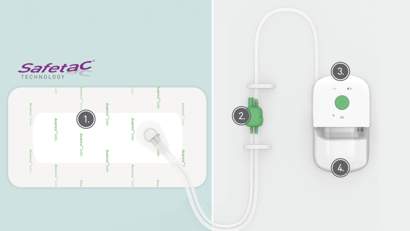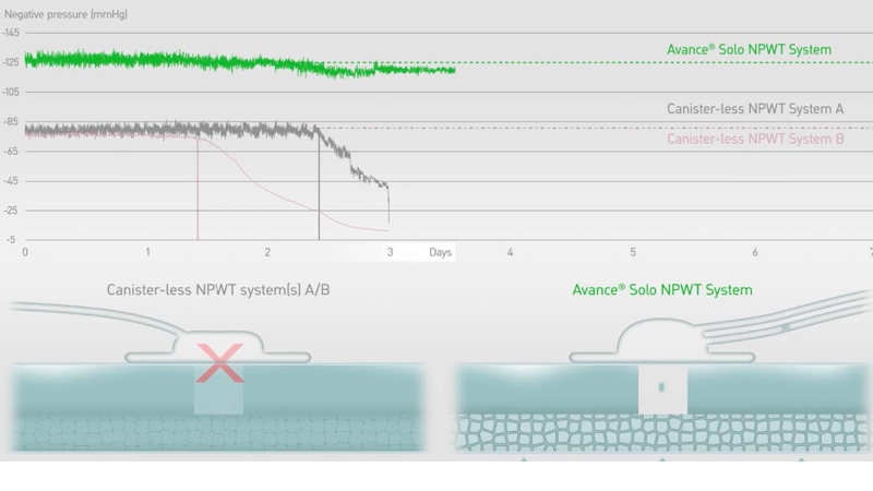 Controlled Fluid Management (CFM) technology™ enables the Avance Solo NPWT System to deliver consistent, regulated negative pressure to the wound site while transporting exudate from the wound to the dressing and canister.2 -
