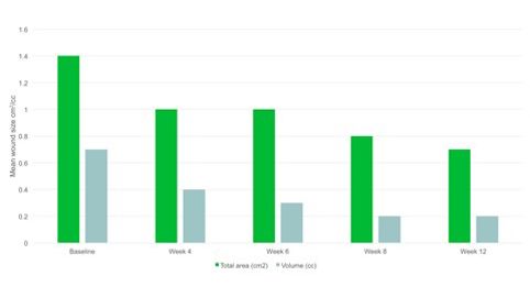 - By week 12 the mean wound area had halved compared to baseline, with a mean area of 0.7cm2.