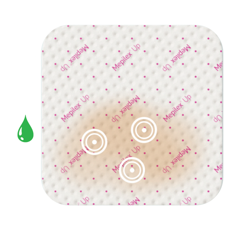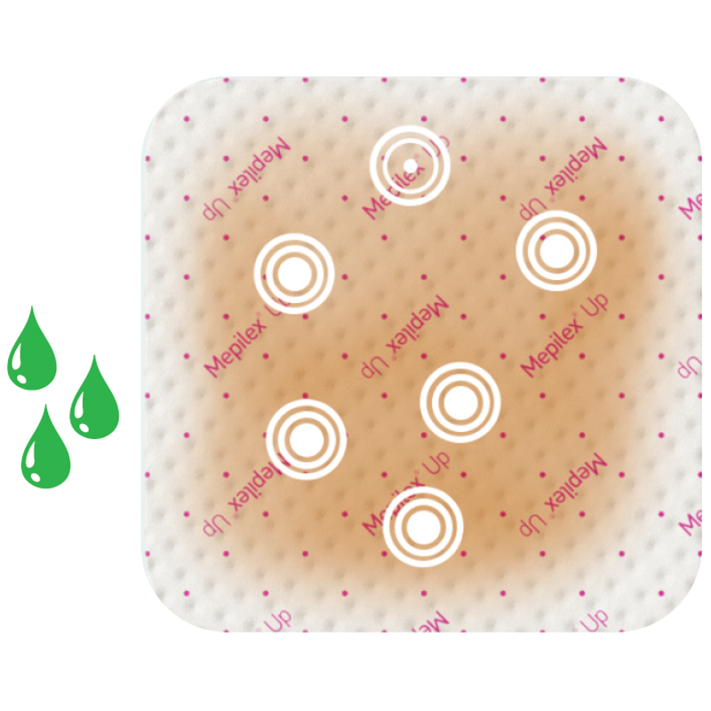Mepilex Up is an innovative foam dressing intentionally designed to minimize the risk of leakage and prevent its spread to healthy skin.