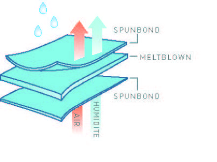 • Meltblown (couche centrale) : permet une barrière efficace contre les fluides et les particules