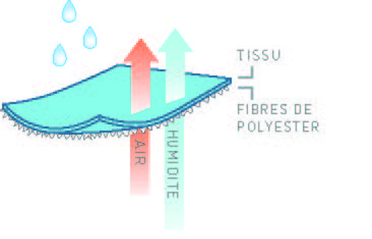 • La couche interne, composée de fibres de polyester, assure la résistance mécanique de la casaque. Ces fibres sont intégrées dans le tissu à l’aide de jets d’eau à haute pression.