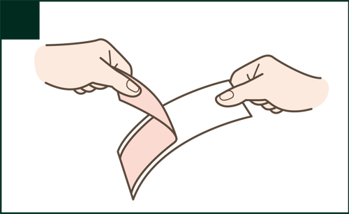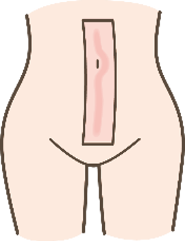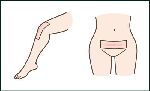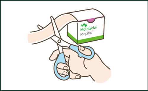 ③余裕をもって傷あと全体をカバーできるよう、伸ばさずに貼ってください。メピタックの粘着力が無くなってきた場合は、使用方法にしたがって、新しいものと交換してください。