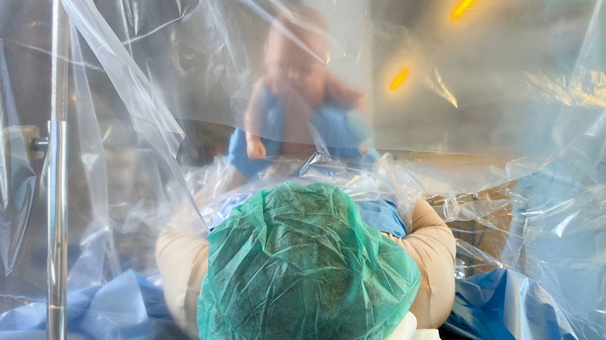 - Dankzij het geïntegreerde transparante paneel over de gehele breedte van het sectiolaken kan zowel de moeder als vader de geboorte van het kind visueel meemaken.