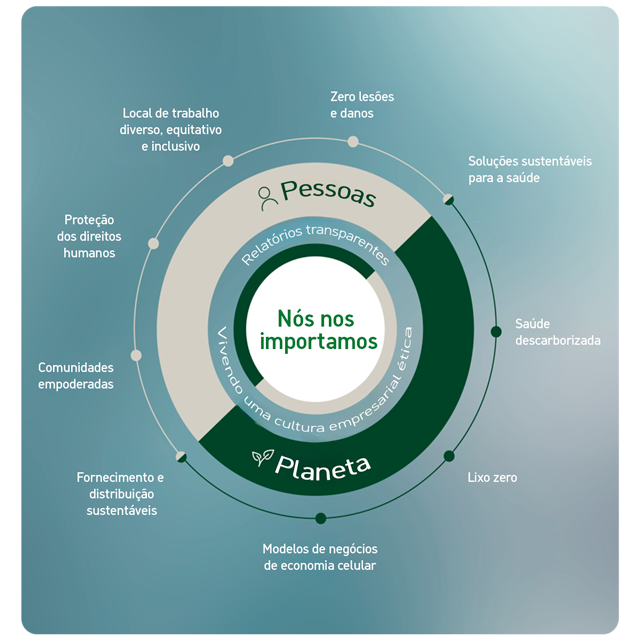 Estamos comprometidos em transformar nossos negócios para nos tornarmos líderes globais em saúde sustentável. Essa transformação envolve incorporar a sustentabilidade em todos os aspectos de nossas operações, ofertas e parcerias.