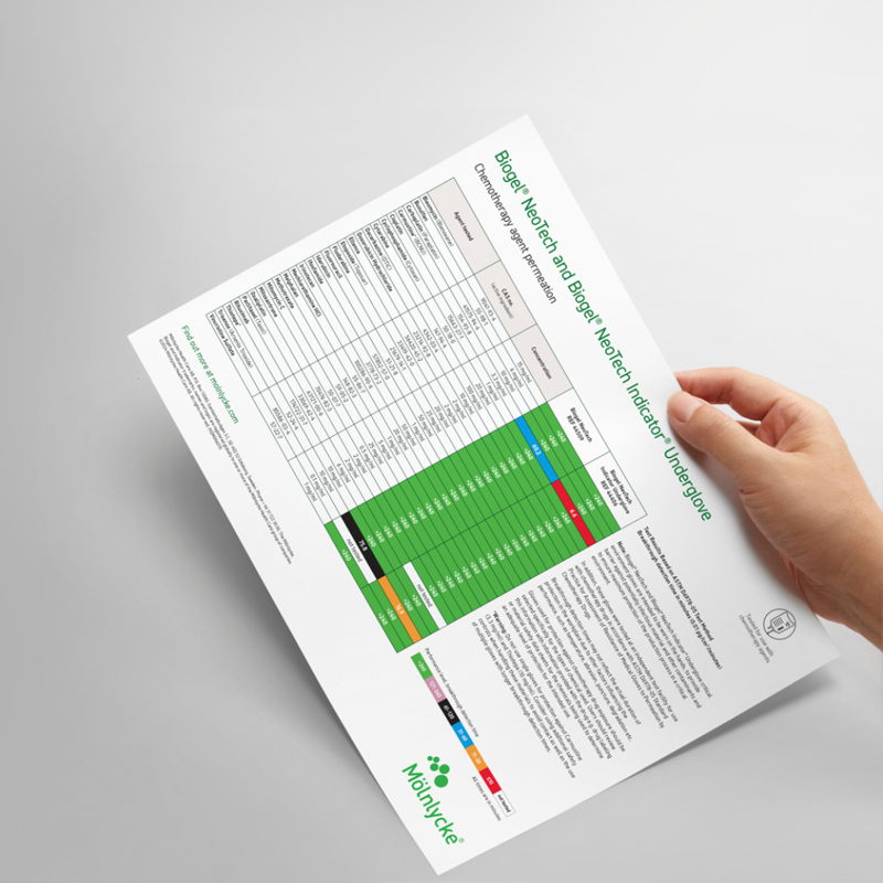 Olika arbetsuppgifter kräver olika material och materialtjocklekar, som är kompatibla med varandra. Vänligen se våra datablad för information om genombrottstider för kemikalier och cytostatika.