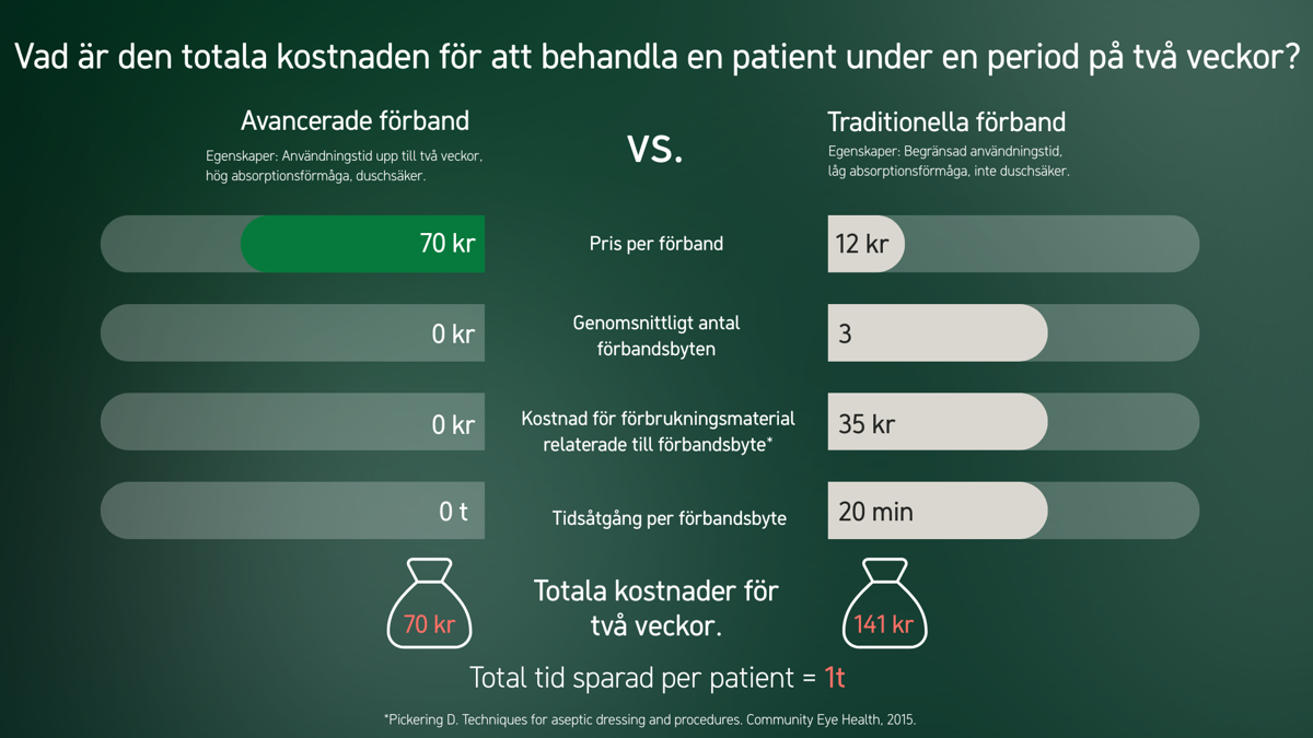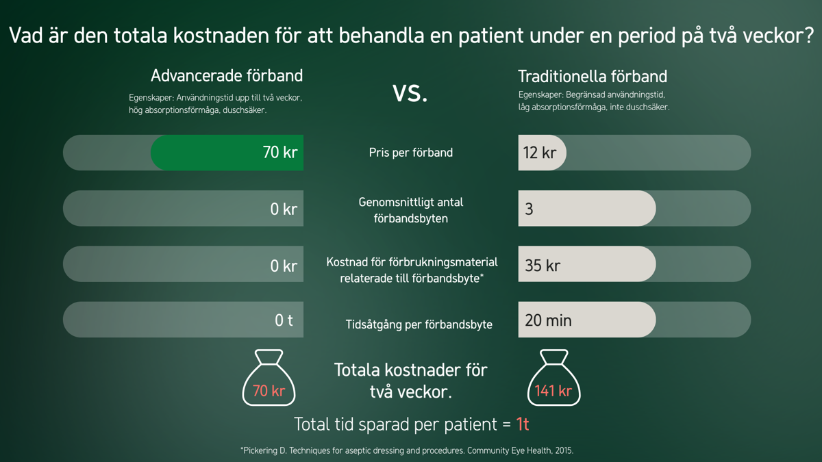 När du utvärderar kostnader ger priset per förband inte hela bilden. Traditionella förband kräver ofta upprepade byten, vilket ökar klinisk arbetsbörda och kostnader.1,2,3 Avancerade förband kan sitta kvar mycket längre, vilket inte bara främjar ostörd sårläkning utan också potentiellt kan minska de totala kostnaderna för postoperativ sårbehandling.